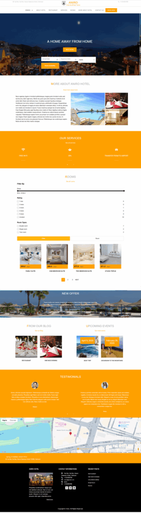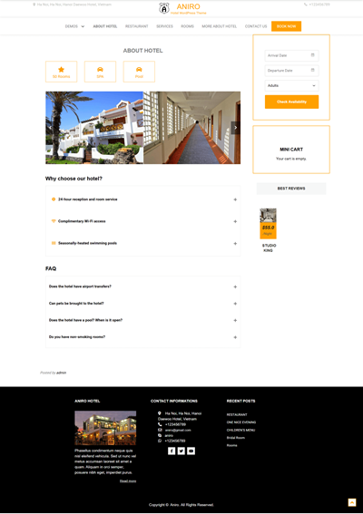 Aniro Hotel is the ideal WordPress theme for hotels, motels, hostels, B&B, room/apartment rental services. Aniro Hotel integrated with the WP Hotel Booking plugin, solves your entire booking system efficiently. You can use payment sistem that integrated in WP Hotel Booking plugin (PayPal, Offline, Stripe, Authorize.Net) or you can use all power from woocommerce for your hotel. Easy to install, easy to manage!