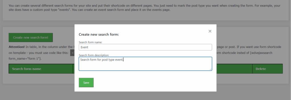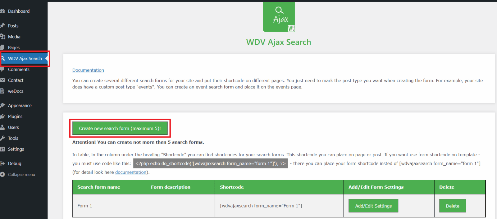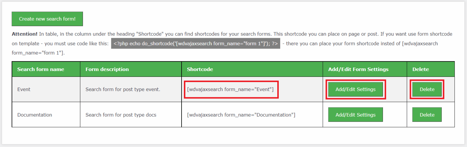 You can see shortcode for your search form and you can choose settings or delete form if you do not need it: