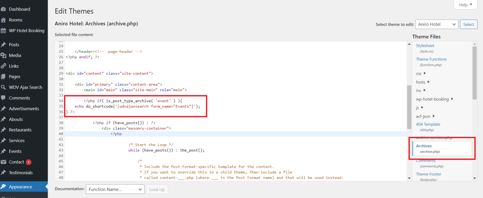 <?php if (is_post_type_archive('event')) { echo do_shortcode('[wdvajaxsearch form_name="Events"]'); } ?>When a site visitor enters search text into the form, search results appear below the form: