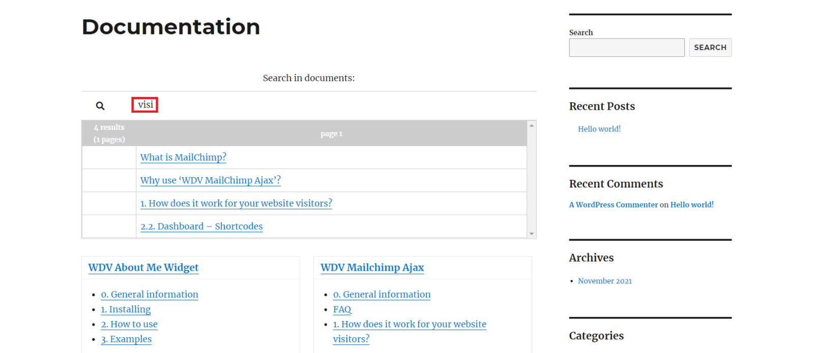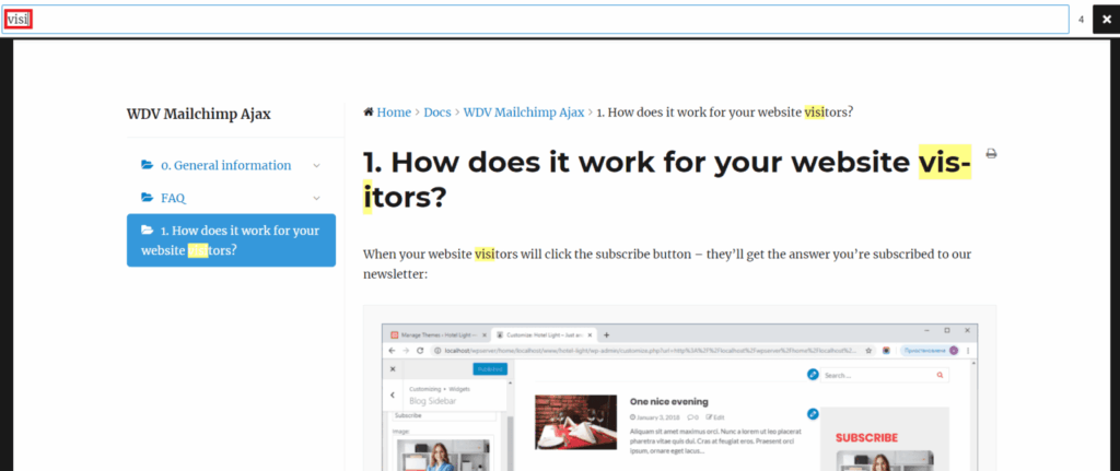 If during the creation of the form on the "General -> Search by" tab the item "Title & Content" was selected and the visitor opens any of the found pages - on this page the found search text will be highlighted in color: