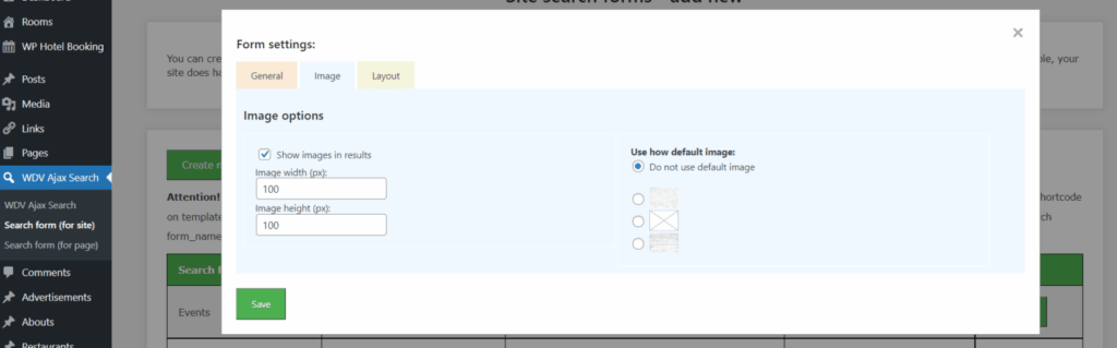 On the tab "Image" you can choose whether to show images in search results. You can choose size of the pictures and select the default image which will be shown if post have no picture: